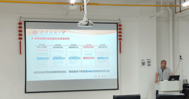 实验室主任刘丰对《高等学校实验室安全规范》进行详细解读,分析了安全责任体系各层级的分工和责任,强调了“谁使用、谁负责、谁主管、谁负责”的原则,把责任落实到岗位或个人,对文件中追责问责政策进行了解释。在《高等学校实验室安全分级分类管理办法(试行)》相关内容解读中,引用华中科技大学资产处“为何分、谁来分、怎么分、怎么管”跟大家进行了分析,阐明了分级分类后的实验室管理方式。