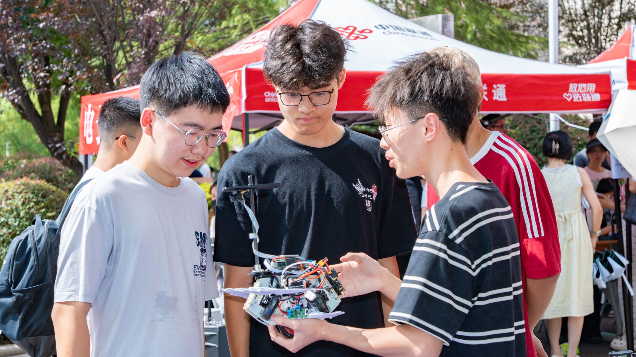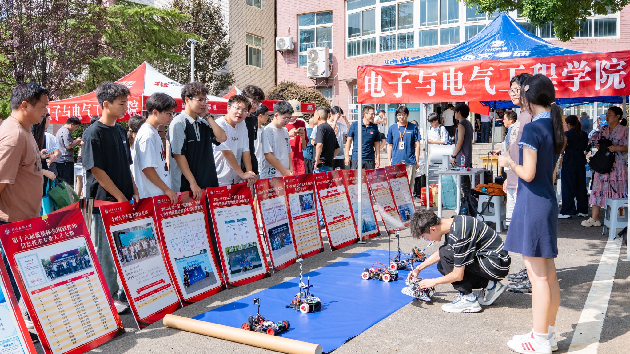 在迎新现场,最引人注目的是智能车展区,集中展示了学院在学科竞赛中的优秀获奖作品。其中,通信工程12301班王荣辉等同学研发的“霍金新轮椅nxp两轮车”搭载高清视觉传感器与自适应PID控制算法,能在模拟复杂路况中精准避障;独轮车模“浪遏飞舟”凭借IMU惯性测量单元与卡尔曼滤波算法,能在狭小空间内保持稳定平衡,还能精准识别信标灯并触发熄灭机制,引发新生阵阵惊叹。在场家长们也纷纷举起手机记录,为学生的科研创新成果点赞。