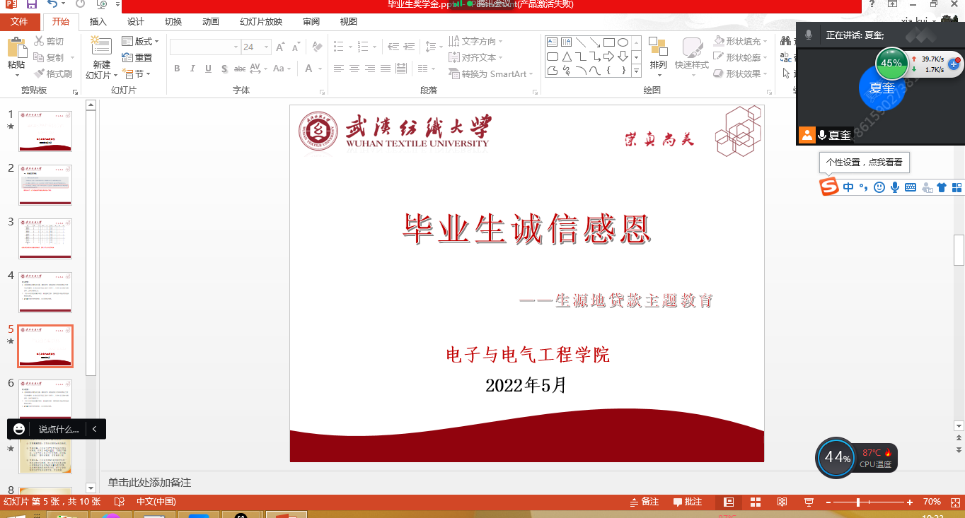 5月5日上午,雷火竞技平台在腾讯会议平台召开毕业生诚信感恩教育之生源地信用助学贷款政策宣讲会,毕业生辅导员夏奎老师主讲,2018级各班班委、生源地贷款学生参加了宣讲。