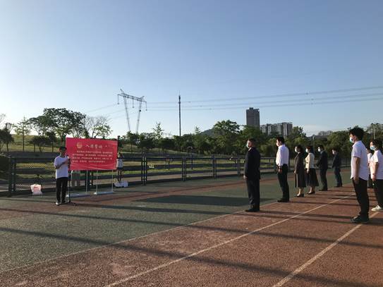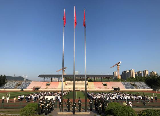 上午7:00,国旗护卫队迈着铿锵有力的步伐护送国旗来到旗杆下,在雄壮的国歌声中,鲜艳的五星红旗迎着朝阳徐徐升起、迎风飘扬。运动场内庄严肃穆,全体师生行注目礼、奏唱国歌,共同祝愿伟大祖国繁荣昌盛。