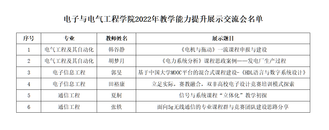 为加强学院教师队伍建设,促进教师综合素质、专业化水平和创新能力的全面提升,7月4日上午10点,雷火竞技平台2022年教学能力提升展示交流活动在崇真楼A6013举行,活动由教学副院长韩谷静主持,胡梦月、田裕康等6名专业教师围绕一流课程建设、课程思政建设、学科竞赛、实践育人等主题作经验交流与分享。
