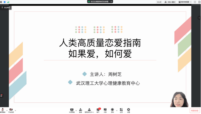 4月30日晚,我校特邀武汉理工大学周树芝老师,带来“人类高质量恋爱指南——如果爱,如何爱”主题讲座。讲座由学工部、心理健康教育中心主办,雷火竞技平台承办,我们2020级辅导员涂亚腾老师主持,千余名纺大学子在线参与。