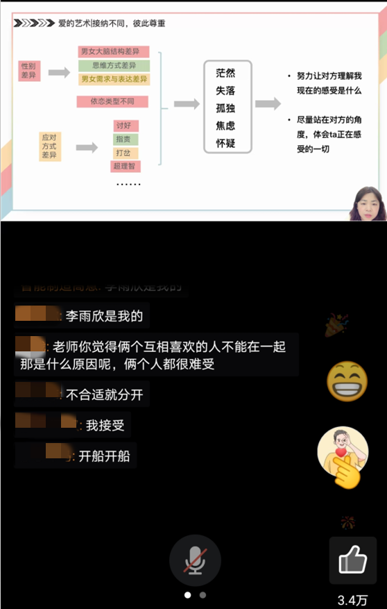 参加讲座的同学们认真聆听,积极在线提问、互动,“喜欢一个女生不敢表白怎么办”,“我和男朋友彼此喜欢对方,但就是经常吵架,很苦恼”,“异地恋该如何相处”…。周老师不时给同学们答疑解惑,并给出相应建议,“对于女生,你若盛开,蝴蝶自来;对于男生,当你想在草原上去追一匹骏马,发现特别困难时,不如更好的去种你的草原”。