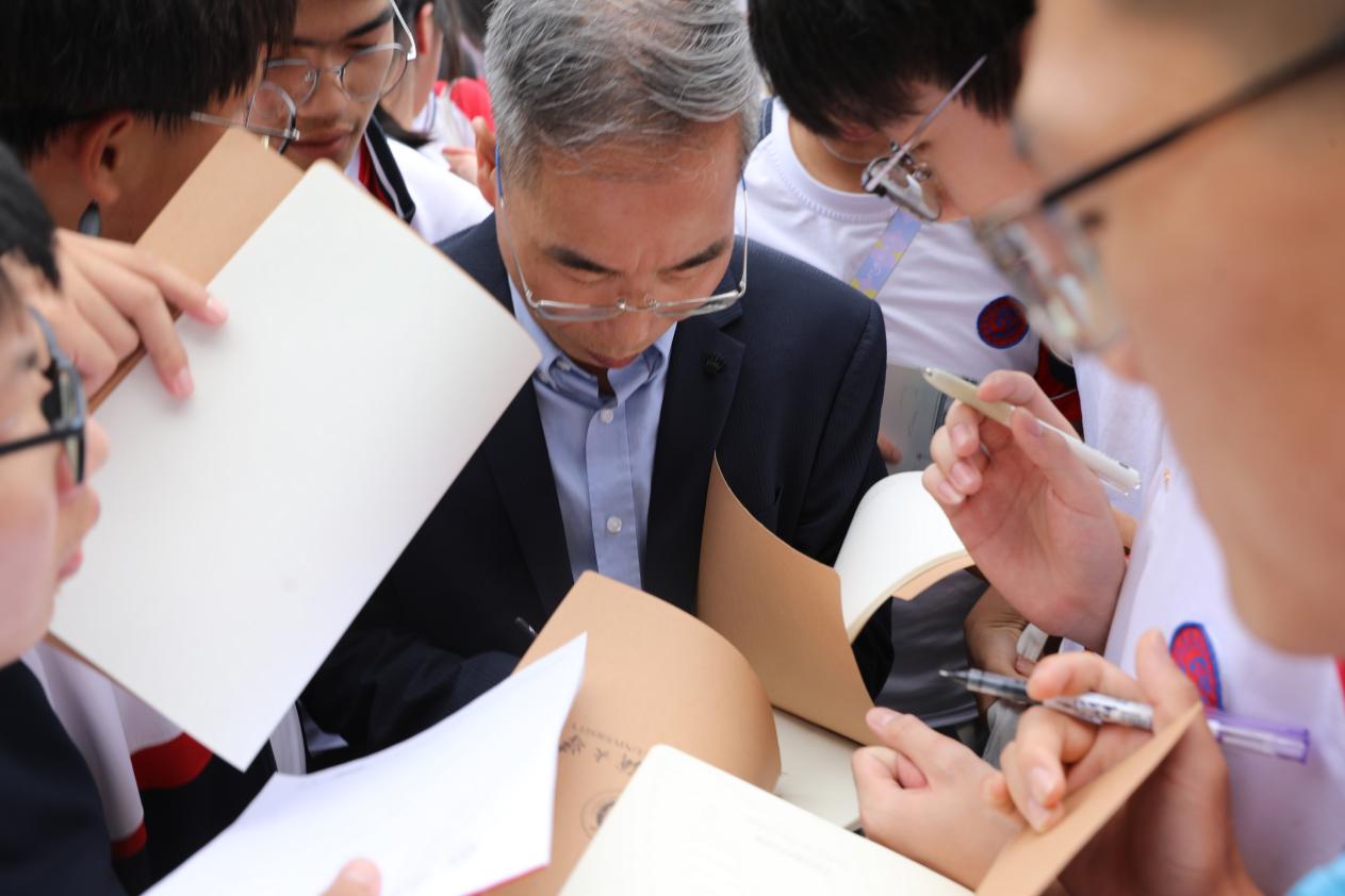 在纺大校园,罗田一中学子们见到了平时心心念念的校友、学长、榜样徐卫林院士,非常激动兴奋,纷纷围在院士周围“索要”签名。徐卫林院士和罗田一中学子们亲切交谈,并现场开展了一场特别的“校长答疑课”。针对罗田一中学子提出的“如何通过自身努力考上心仪的高等学府”、“如何度过艰苦充实的高三岁月”、“如何在高考填报志愿中选择适合自己的专业”等问题,徐院长和大家分享了自己的求学经历和奋斗历程,解答了同学们心中的疑问。他告诫大家,要以积极的心态对待学习、生活,遇到不如意时要正确看待,做好当下的事情,坚持下去一定会有好的成果。他祝愿罗田一中发展越来越好,祝愿罗田一中学子们早日实现自己的人生理想。