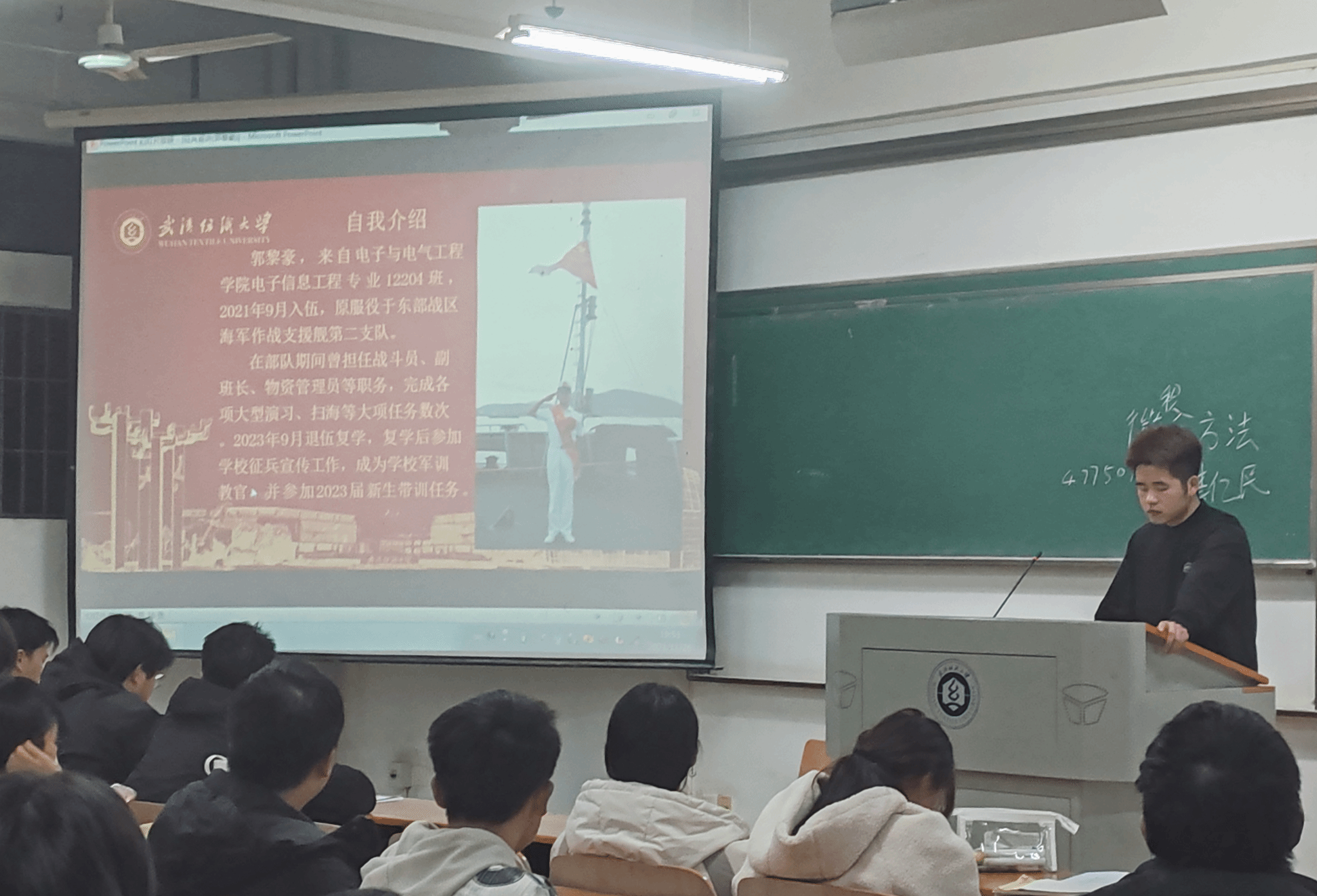 为扎实做好学院2024年上半年征兵工作,进一步提升学生的国防意识,激发大学生应征入伍热情,扩大征兵宣传覆盖面和影响力。11月26日雷火竞技平台在YG06-110、111教室召开”携笔从戎,青春无悔”大学生征兵入伍宣讲会。宣讲会特邀退役大学生,电子信息工程专业12204班郭黎豪进行讲解。