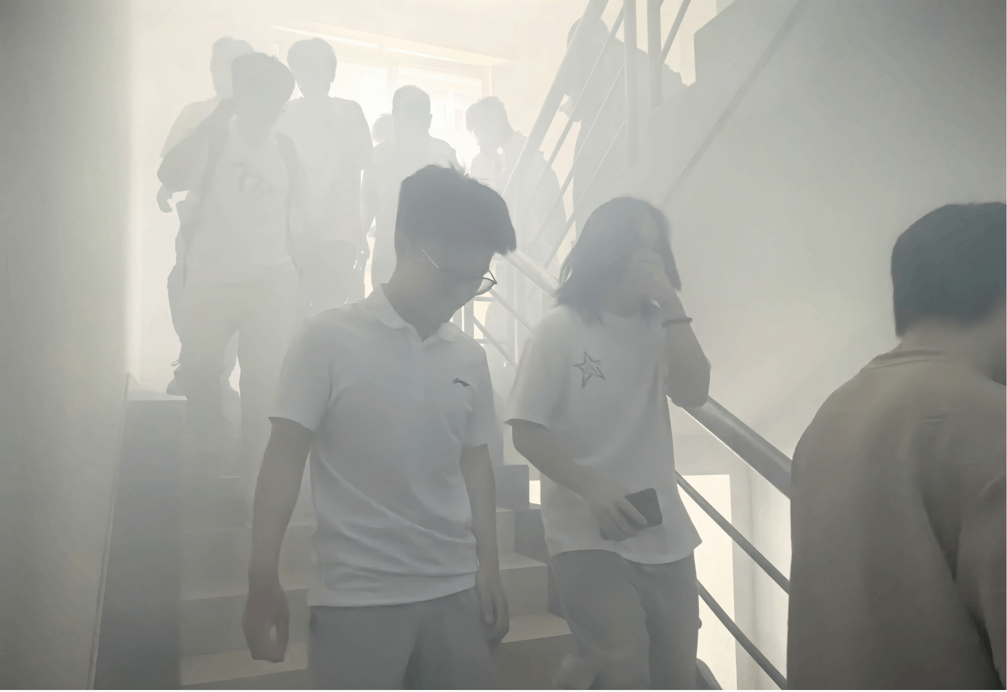 随后,消防疏散实战演练在“电燃梦想”一站式学生社区服务驿站进行。消防警报声响起后,参与演练的师生反应迅速,严格按照应急逃生路线有序疏散,用衣服等物品捂住口鼻,低姿、快速穿越烟雾区,顺利到达安全区域。刘诚老师结合现场演练情况,就如何预防火灾、怎样正确报警、逃生注意事项等进行了补充强调,提醒大家正确用火用电。