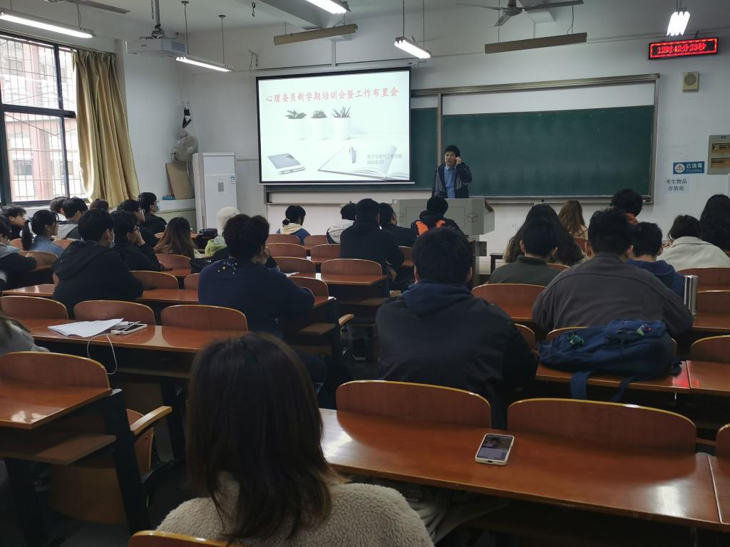 新学期伊始,为强化我们学生心理健康教育队伍建设,布置新学期工作。充分发挥班级心理委员的积极作用,熟悉心理委员的工作职责和要求,切实提高我们学生的心理健康水平。3月19日中午,雷火竞技平台心理委员培训会顺利在三栋教学楼110教室召开。辅导员吴昊老师、阳光“E”栈全体成员及各班心理委员参加本次会议。