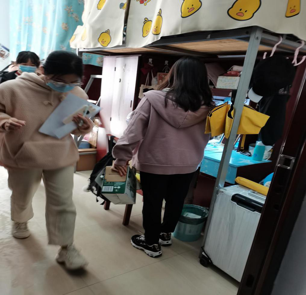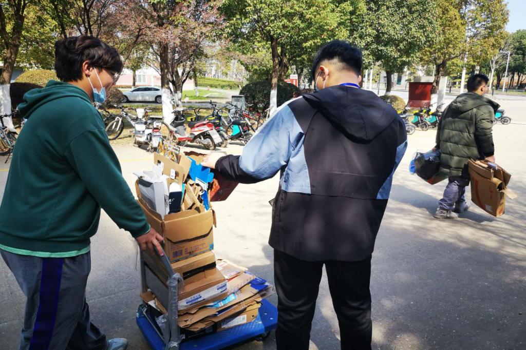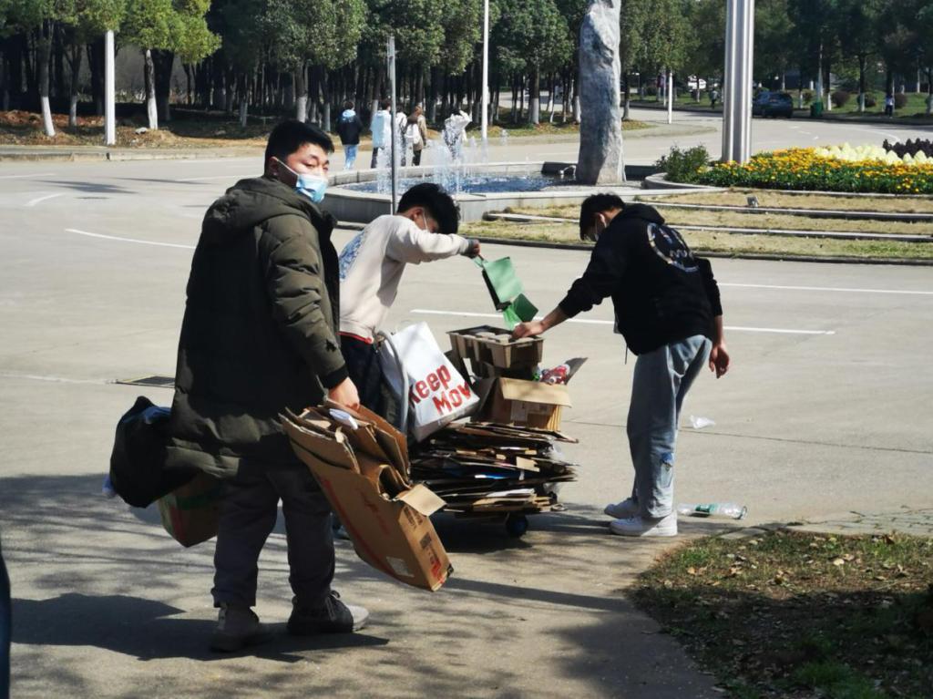 此次活动在宿管会部长朱敏和志愿服务部部长骆亚星的组织下,所有志愿服务的干事们,佩戴好口罩,携带工作牌,分成8个小组,深入我们楼8栋、11栋宿舍,进行纸盒回收的活动。