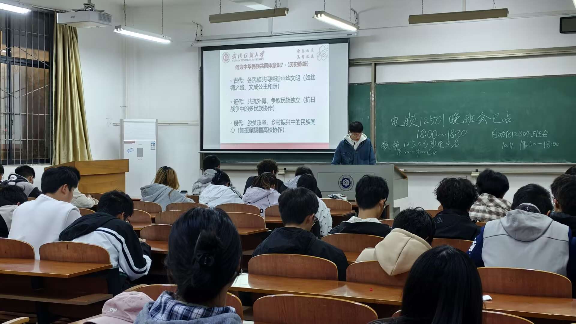 班会现场,辅导员以“凝聚青春力量·共筑复兴梦想”为引,明确中华民族共同体意识以爱国主义为核心,结合新时代与民族复兴、文化自信的结合特征,让学生深刻理解其精神内核。与此同时,班会还聚焦校园电动自行车安全管理痛点,详细讲解了引入共享电动车、完善基础设施、开展实名登记授牌等举措,以及下一阶段依托学院、学生、管理三方推进宣传教育、专项整治、规范登记的重点工作,呼吁学生优先选择共享出行,遵守校园交通规则。